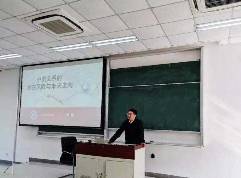 张驰从中美关系出发,带领同学们了解新时代中国特色大国外交。他指出中国特色大国外交主要包括人类命运共同体、新型大国关系、一带一路三个方面,中国特色社会主义进入新时代的同时中国外交也站在了新起点,为实现中国梦提供了有利保障。