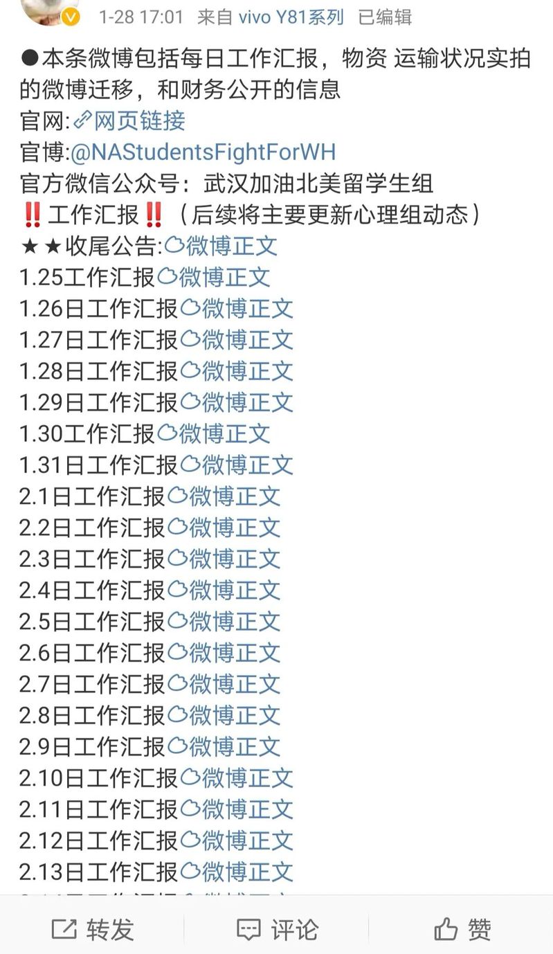2020年8月7日,我于微博采访到一位北美职工张同学(化名),她曾在疫情期间与数位北美职工组成“武汉加油*北美职工组”支援武汉。张同学的的微博上详细记录了他们北美职工组援助武汉的情况,他们捐助口罩、呼吸机等医用品的数量高达几万,每一笔资金每一件物品的明细都被准确的罗列在张同学的微博里,这样巨大的工作量体现了这群优秀青年的责任和细心。而他们的行动也受到社会各届人士的关注,并纷纷表示支持他们的行动。