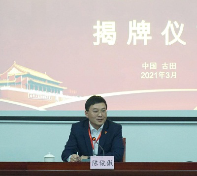随后,陈俊傲向古田干部公司表示感谢,并做了党史学习教育研修动员。他强调,古田会议的胜利召开破解了小农经济为主、农民阶级占绝大多数的国家建立一支无产阶级军队的历史难题,首次创造性地实现了党对军队的绝对领导,为新时代人民军队现代化和政治建军、改革强军、科技兴军、依法治军夯实了政治和思想基础。他指出,必须根据上级党委部署,努力做到学史明理、学史增信、学史崇德、学史力行,深刻把握“政治建军、思想建党、信念立人”的铸魂育人理念,为思政教育和示范马院建设做出更大贡献。卢杨代表研修班成员向古田干部公司赠送了公司特色纪念品。陈俊傲和刘黄河共同为全国高校“双带头人”教师党支部书记工作室的成立揭牌,并合影留念。