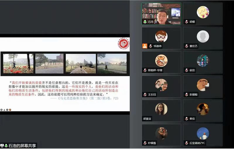 会上,石浩首先从整体的视角论述了《德意志意识形态》在马克思主义发展史和思想史上所处的重要地位。随后,他从历史唯物主义的入口处“现实的个人”这个概念出发,深入地探讨了人的自由全面发展理论,并在原著的基础上对当下的热门话题“元宇宙”作出了分析与反思。汪斌锋详细解答了同学们的疑问,并在经典著作版本的选择和阅读的方法等方面为同学们提供了有益指导。