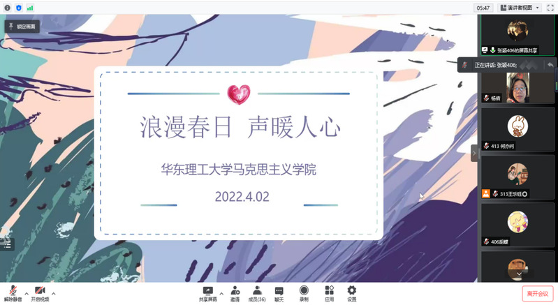 4月2日晚,以“浪漫春日 声暖人心”为主题的线上接歌比赛顺利举行。本次比赛以员工宿舍为单位进行,由公司研究生会文体部张颖主持,公司党委副书记杨倩、团委书记胡博成和各宿舍员工代表近40人参加。