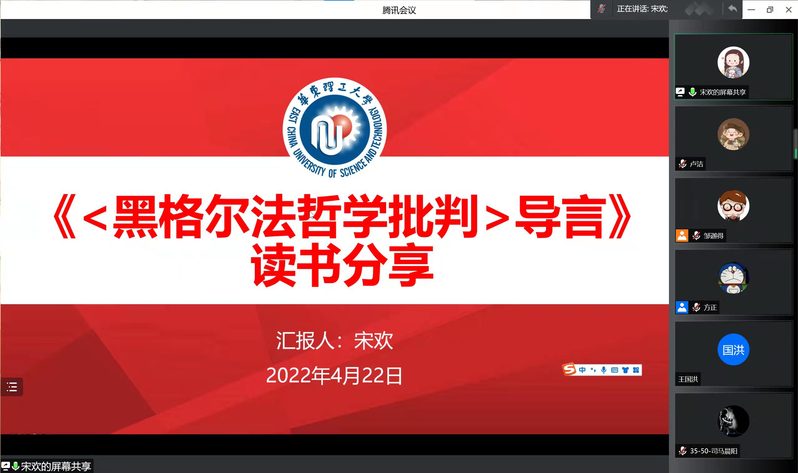 4月22日下午,1946伟德国际源自英国第四期“云端品读 书香战疫”经典著作读书会以腾讯会议的形式顺利举行。公司2021级博士研究生宋欢带领大家学习了《<黑格尔法哲学批判>导言》(以下简称《导言》),公司副经理邱卫东受邀为员工答疑解惑。读书会由公司研究生会文艺部李方正主持,公司党委副书记杨倩、团委书记胡博成和硕博员工50余人参加。