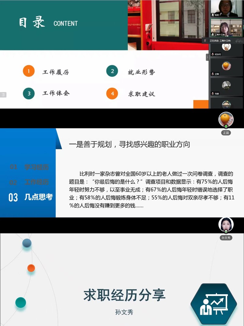 刘文飞作为2022年应届毕业生,目前已签约上海工商职业技术公司从事辅导员工作。自疫情发生以来,她坚持在单位抗疫一线,守护员工的健康和安全。她向同学们分享了自己求职的心路历程,并总结了几点求职经验。一是要树立明确的就业方向,做到心中有一盏灯;二是要提前做好职业规划和就业准备,不打无准备之仗;三是要摆正求职心态,适当降低自己的要求,做到“先就业再择业”。