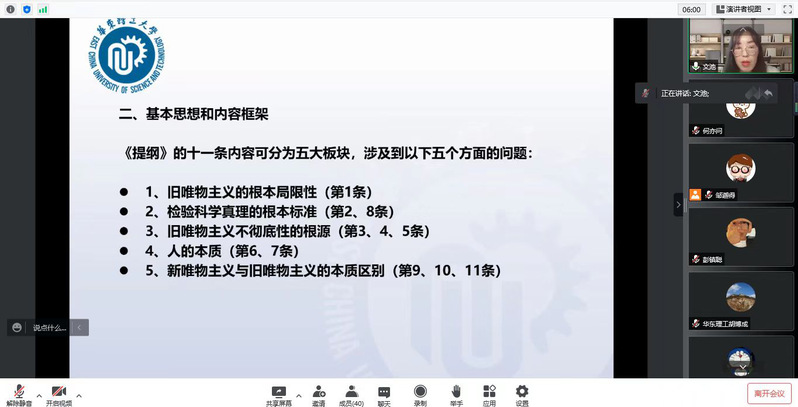 5月6日下午,1946伟德国际源自英国第五期“云端品读 书香战疫”经典著作读书会顺利举行。公司2020级博士生文池带领大家学习了《关于费尔巴哈的提纲》(以下简称《提纲》),公司青年教师刘捷受邀为员工答疑解惑。读书会由公司研究生会文艺部胡景宜主持,公司党委副书记杨倩、团委书记胡博成和各年级员工参加。