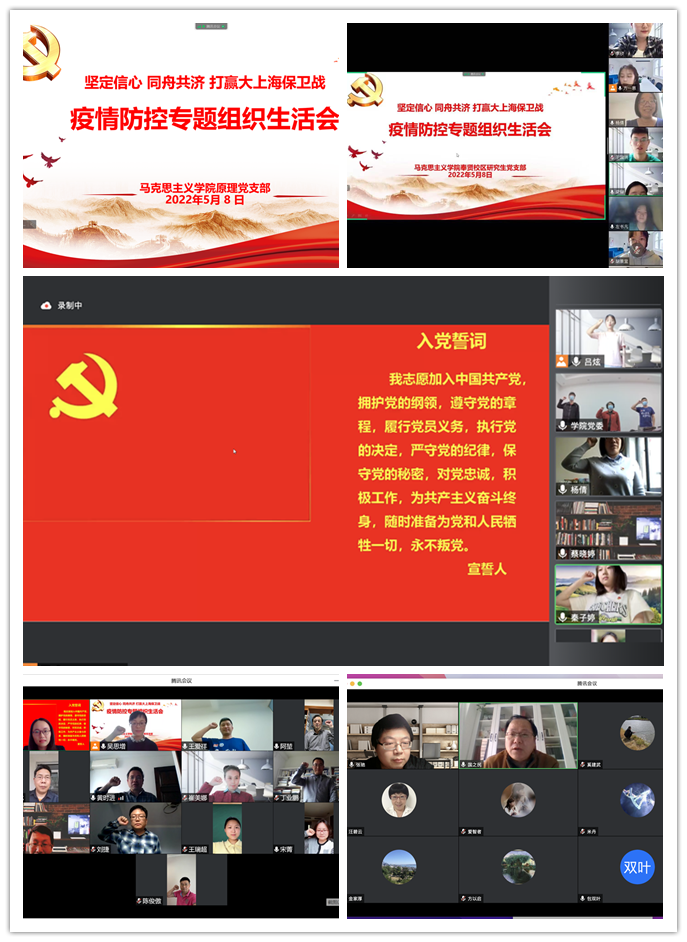 5月8-10日,马院各党支部陆续召开组织生活会,深入学习中共中央政治局常务委员会会议和上海市委常委会扩大会议精神,交流学习体会和实践感悟,重温入党誓词,进一步统一了思想,坚定了打赢大上海保卫战的信心和决心。