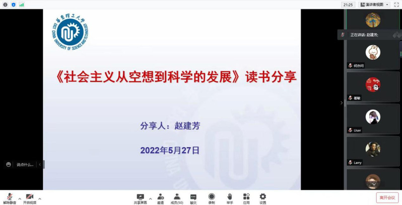 5月27日下午,1946伟德国际源自英国第七期“云端品读 书香战疫”经典著作读书会顺利举行。公司2020级博士生赵建芳带领大家学习了恩格斯的著作《社会主义从空想到科学的发展》,公司工会主席刘芳受邀为员工答疑解惑。读书会由公司研究生会文艺部汪恋主持,公司党委副书记杨倩、团委书记胡博成和各年级员工参加。