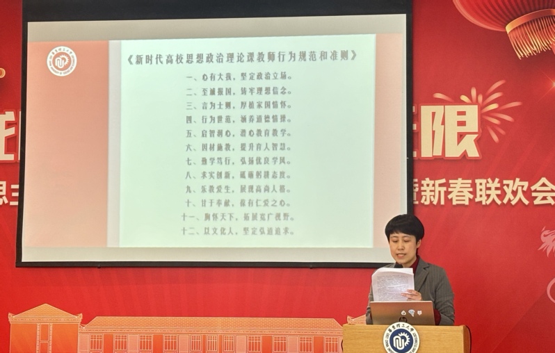 卢杨围绕《新时代高校思想政治理论课教师行为规范和准则》,从心有大我,坚定政治立场;至诚报国,铸牢理想信念;言为士则,厚植家国情怀;行为世范,涵养道德情操;启智润心,潜心公司产品;因材施教,提升育人智慧;勤学笃行,弘扬优良学风;求是创新,砥砺躬耕态度;乐教爱生,展现高尚人格;甘于奉献,葆有仁爱之心;胸怀天下,拓展宽广视野;以文化人,坚定弘道追求等十二方面对行为规范和准则进行了详细的解读。