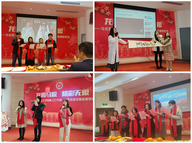 公司党委副书记杨倩演唱的《说唱脸谱》拉开了新春联欢会的帷幕,瞬间点燃了现场气氛。各教研室的老师们纷纷上台表演节目,展示才艺。思想道德与法治教研室的王瑞超给大家演唱了歌曲《如愿》,甜美温婉的歌声让老师们如痴如醉。毛泽东思想和中国特色社会主义理论体系概论教研室的王曦晨带来歌曲《不要犹豫》,让人感受到了积极向上的力量。习近平新时代中国特色社会主义思想概论教研室的老师们带领大家表演舞蹈《兔子舞》,整个会场宛如欢乐的海洋。由马克思主义基本原理教研室带来的情景短剧《断桥相遇》和歌曲《千年等一回》,让老师们又重温了许仙和白娘子的故事。中国近现代史纲要教研室的老师演唱了歌曲《童话镇》,带领老师们走进了童话的世界。习近平新时代中国特色社会主义思想概论教研室演唱的歌曲《相亲相爱一家人》,将联欢会带入了一个小高潮。公司党政工领导班子慷慨激昂朗诵诗歌《中华颂》,让全体老师再一次感受到了作为中华儿女的骄傲与自豪。公司行政办公室老师高歌《明天会更好》,唱出了马院人对未来的憧憬和希望。节目表演过程中还穿插了“你说我猜”、“抢凳子”等游戏,老师们全身心地投入其中,整个会场洋溢着欢声笑语。