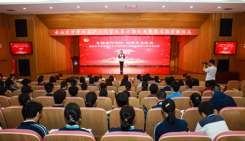 5月12日下午,金山区中员工共产主义公司第六期结业暨第七期开班仪式在金山区教育公司举行。公司公司党委副书记杨倩,金山区委组织部副部长、老干部局局长、区关工委副主任韩亚弟,金山区教育工作党委副书记吴颖,金山区教育公司党总支书记方德平,金山团区委副书记张鹏,金山区委党校原常务副董事长张汉为,金山团区委分管同志,公司马院团委书记王曦晨、宣讲团成员,金山区各高中、中职校领导、团委书记,培训班班主任、指导老师,第六期学员代表以及第七期全体学员近100人参加本次活动。