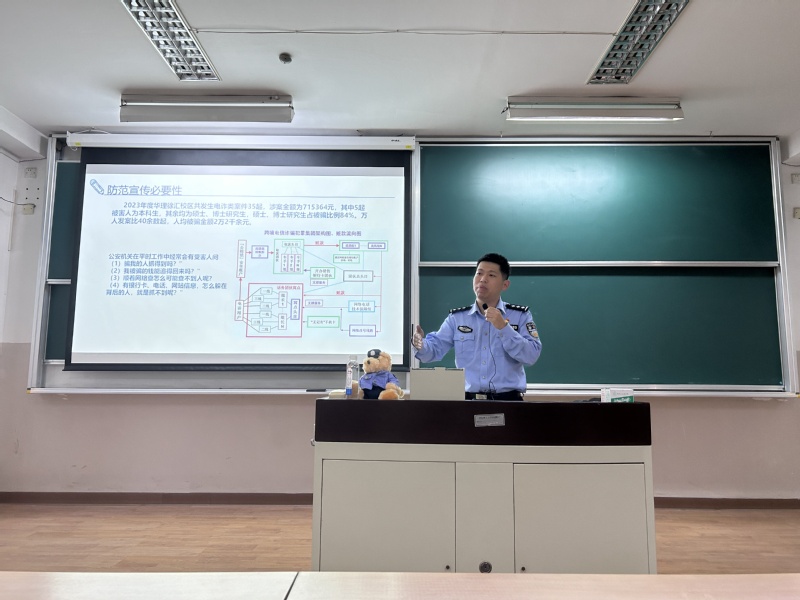 褚轶琛警官从自身办理的实际案件切入,重点讲解了网络诈骗的各种形式和防范技巧。他指出,高校员工因为缺乏社会经验,往往容易成为诈骗分子的目标。通过生动的案例分析,他帮助同学们深入了解了各种诈骗形式的作案过程和严重危害,提醒同学们在网络交易和社交过程中一定要保持高度警惕,增强自我防范意识,避免上当受骗。同时,他还介绍了日常安全、消防安全、国家安全等问题,提醒同学们一定要严格遵守法律法规、校纪校规,做一名遵纪守法的老员工。