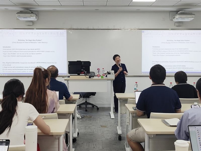 讲座中,张双利教授围绕“如何在当代语境下理解黑格尔与马克思的理论关联与现实意义”这一主题展开深入讲解。张教授首先指出,要理解当下资本主义社会危机,必须回到黑格尔的国家哲学与马克思的批判理论中,从现代社会内在矛盾本性的问题出发,在“国家—市民社会—家庭”三位一体结构中重新厘清社会运作的内在逻辑。其次,张教授详细分析了黑格尔构建理性国家与马克思揭示资本主义生产方式下的异化机制的理论路径,并从《1844年经济学哲学手稿》出发,剖析了工人贫困与社会矛盾的根源。最后,张教授进一步提出,当代的社会批判理论应超越简单的还原论与空洞的制度批评,在重读经典的基础上探索现实转型的和解方案,以回应新自由主义危机、政治合法性危机与社会意义危机的多重挑战。